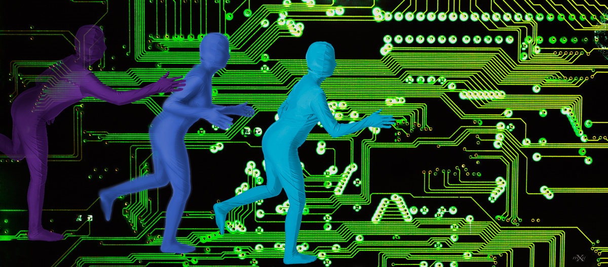 In dem Projekt keep on running stelle ich die immer weiter fortschreitende Digitalisierung und die menschliche Individualität in Bezug. Das Model rennt vor einer Spea Crunch IT V7 Grafikkarte aus dem Jahr 1987.
